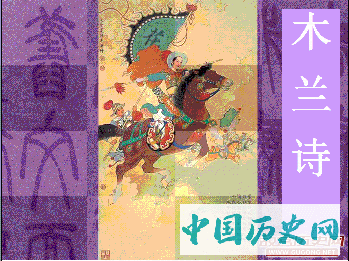 ▶《木兰诗》是中国南北朝时期北方的一首长篇叙事民歌,也是一篇乐府诗。记述了木兰女扮男装,代父从军,征战沙场,凯旋回朝,建功受封,辞官还家的故事,充满传奇色彩。